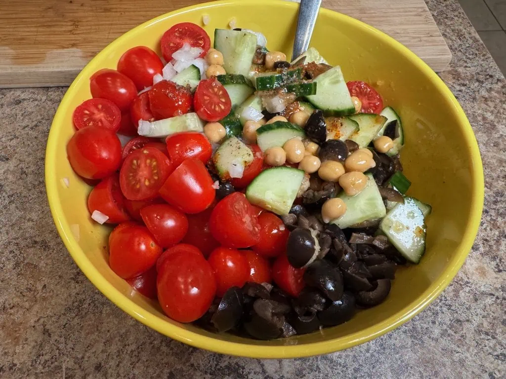 In a large mixing bowl (and I mean large—don’t underestimate this), add the cucumbers, tomatoes, olives, and garbanzo beans.