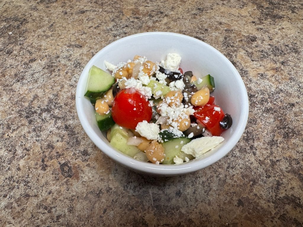 This Greek Garbanzo Bean Salad is a quick and easy, protein-packed dish made with chickpeas, crisp cucumbers, juicy tomatoes, and olives tossed in a zesty Italian dressing with fresh lemon and garlic. It’s light yet filling, comes together in minutes, and tastes even better after chilling. Perfect for a simple lunch, brunch, or make-ahead meal, with optional feta for an extra burst of flavor.